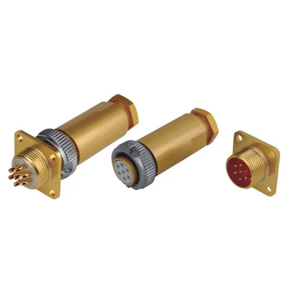 Ronde connector van het PY04-type heeft de kenmerken van klein formaat, lichtgewicht, handige toepassing met schroefdraadkoppeling. Het kan worden uitgewisseld met het Russische type PC-serie, de pinnen van de connector zijn verguld messing, het lichaam is van een goudkleurige aluminiumlegering, de kleur kan veranderen volgens de eis van de klant.